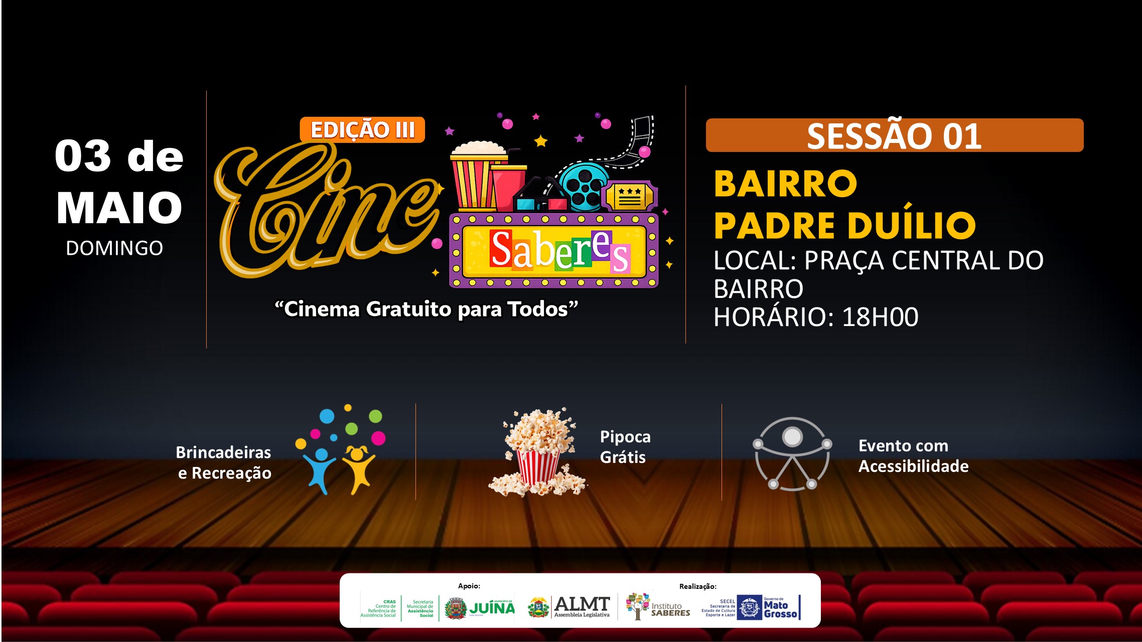 A população de Juína já pode se preparar para mais uma noite especial de cultura, lazer e integração comunitária. A 3ª edição do projeto Cine Saberes terá início no próximo dia 03 de maio (domingo), com uma sessão gratuita de cinema na Praça Central do Bairro Padre Duílio, a partir das 18h.