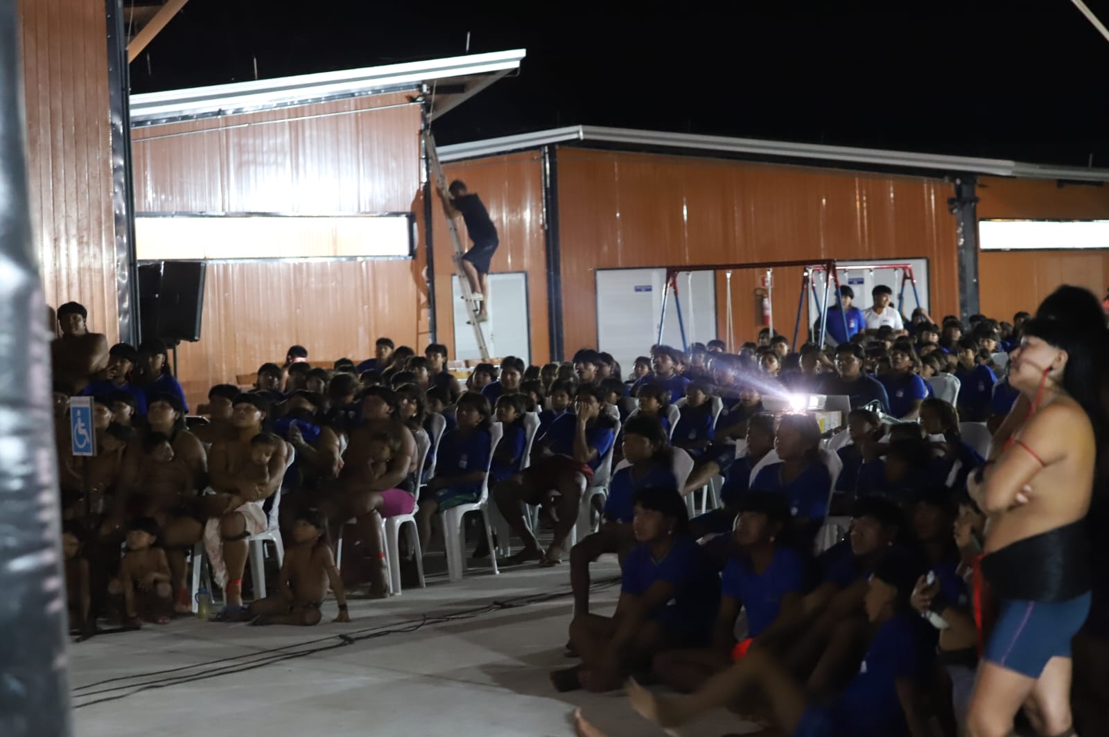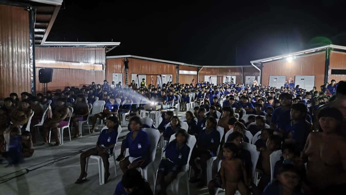 Durante a exibição, o silêncio respeitoso e os olhares atentos mostravam a força simbólica do momento. Crianças sentadas à frente observavam cada cena com curiosidade e encanto; os anciãos sorriam discretamente, reconhecendo nas imagens as belezas e os desafios de seu próprio território. Ao final, aplausos e cânticos espontâneos tomaram conta do espaço, em um gesto coletivo de gratidão e celebração.