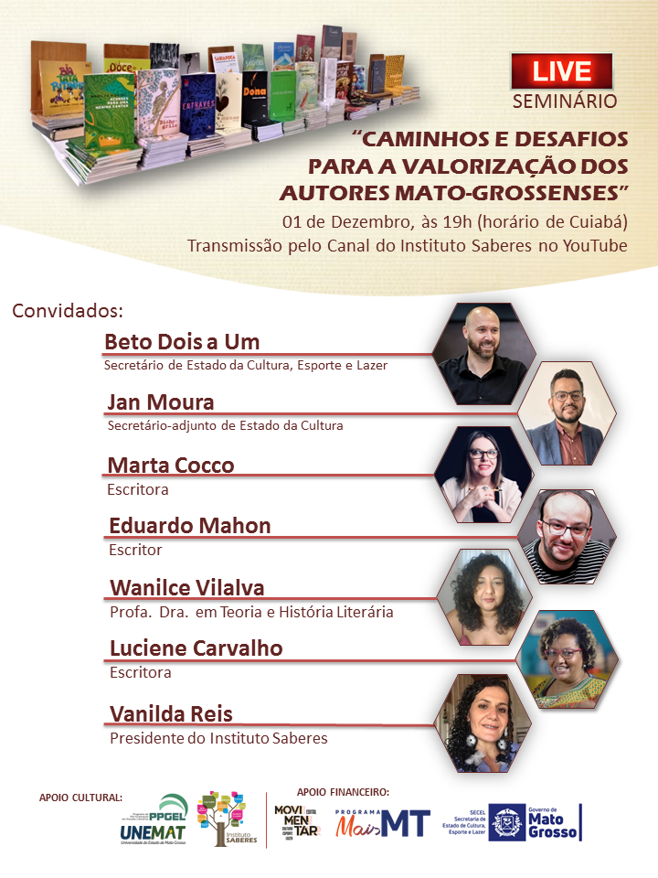 Será realizado na próxima quarta-feira (1º), às 19h, o seminário “Caminhos e desafios para a valorização dos autores mato-grossenses”. O evento será on-line, com transmissão pelo canal Instituto Saberes no YouTube.