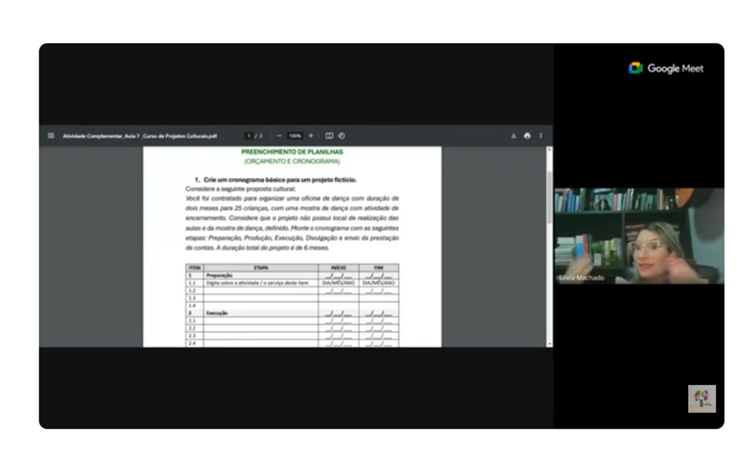 A aula, que faz parte de uma formação gratuita destinada a gestores culturais, artistas, produtores e técnicos do setor, teve como objetivo principal orientar os alunos na organização do orçamento financeiro e do cronograma físico-operacional de um projeto cultural, dois componentes que frequentemente determinam a aprovação ou não de uma proposta.