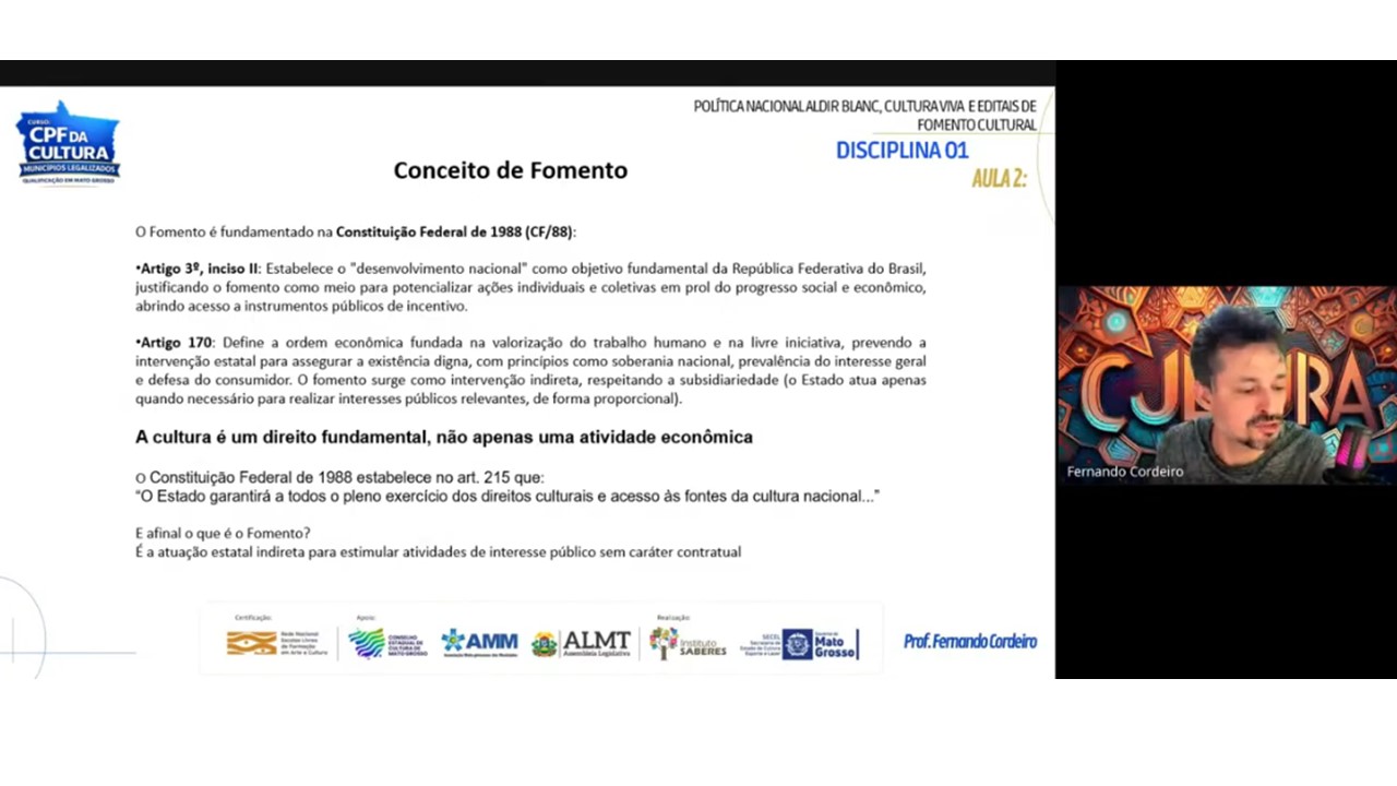 Juína (MT) – A elaboração de editais culturais mais acessíveis, eficientes e alinhados à legislação foi o tema central da aula “Elaboração de Editais e Chamamentos Públicos: Princípios, Formatos e Boas Práticas”, ministrada pelo professor Fernando Cordeiro no dia 14 de abril de 2026, das 14h às 16h, como parte do curso CPF da Cultura.